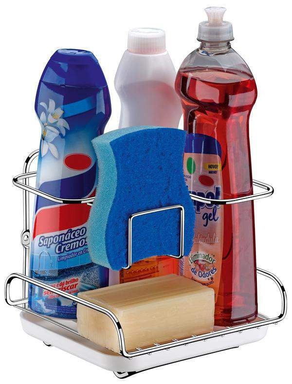 Possui capacidade para armazenar saponáceos, esponja e sabão. Versátil, pode ser deixado sobre a pia ou fixado na porta do armário ou na parede.